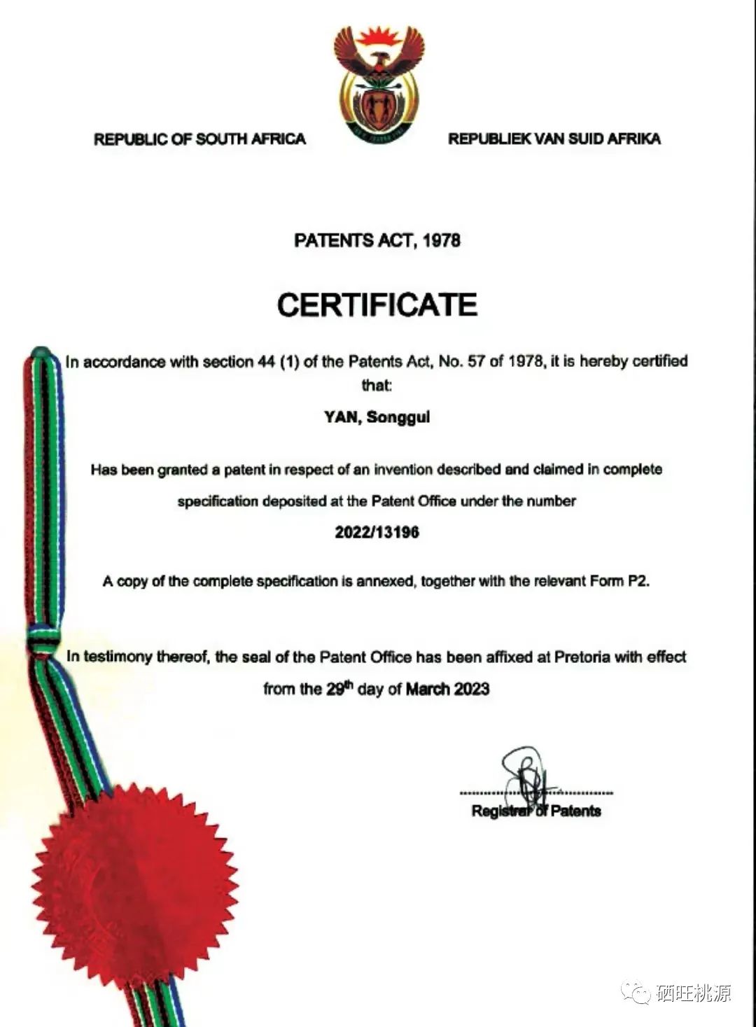 7月14日,從北京傳來喜訊,桃源縣富硒產(chǎn)品研究所申報的“一種多礦物質(zhì)飼料添加劑和制備方法及應(yīng)用”發(fā)明專利,被南非公司與知識產(chǎn)權(quán)注冊局下發(fā)發(fā)明專利證書,于2023年3月29日授權(quán),截止期限:2042年12月6日。專利號:2022/13196。